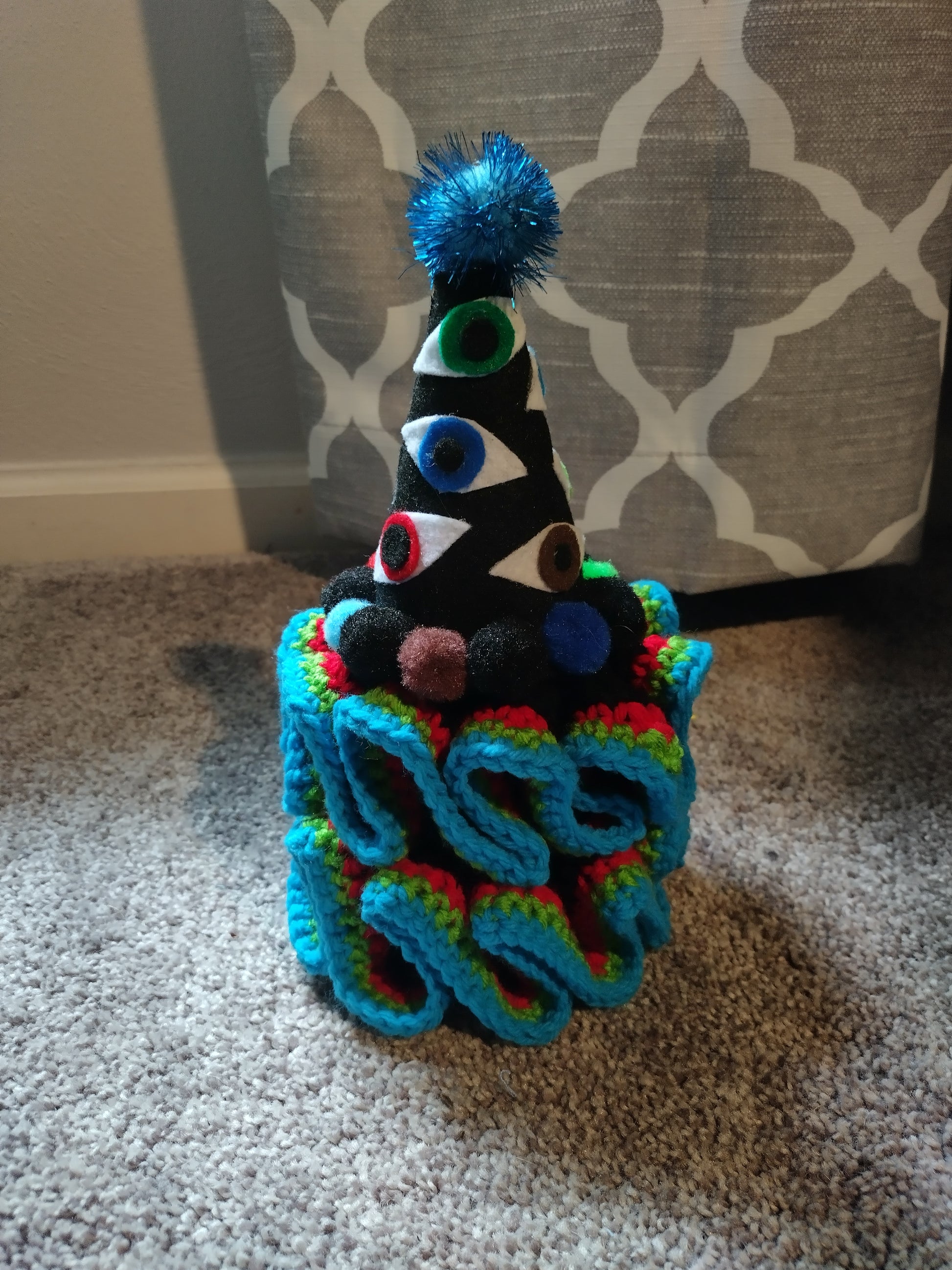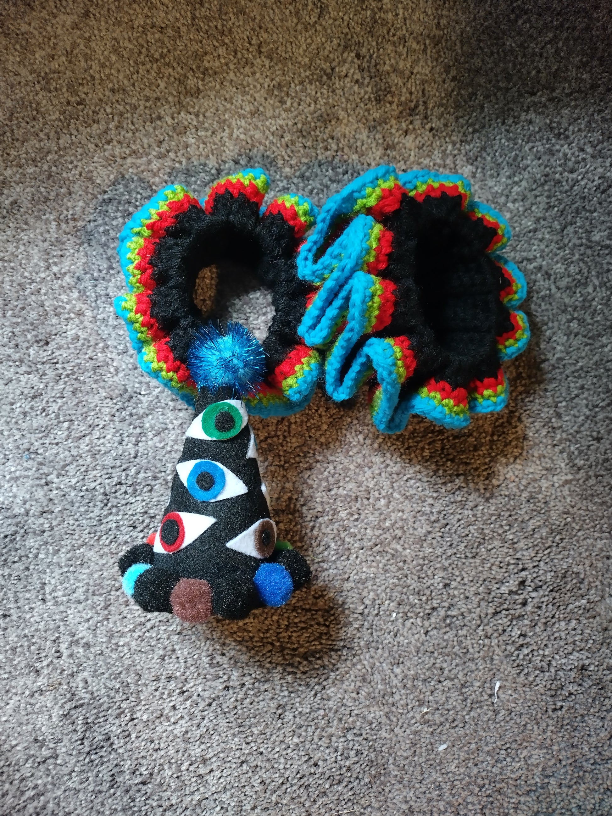 ๐ฉ Felt hat covered in multi-colored eyes + topped with a blue sparkle pom