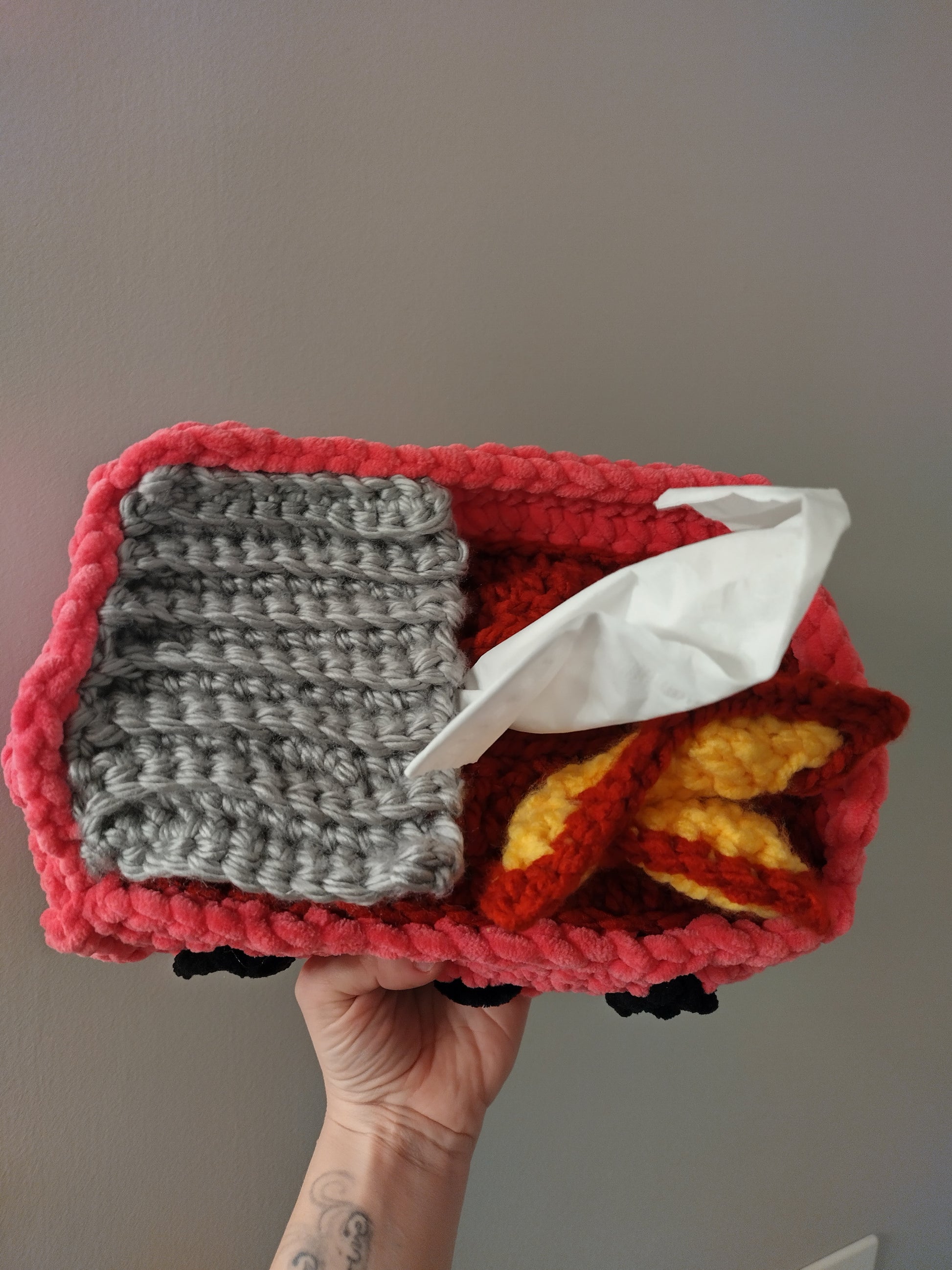 Emotional Support Dumpster Fire Tissue Box Cozy. Hot pink dumpster made with plush yarn.