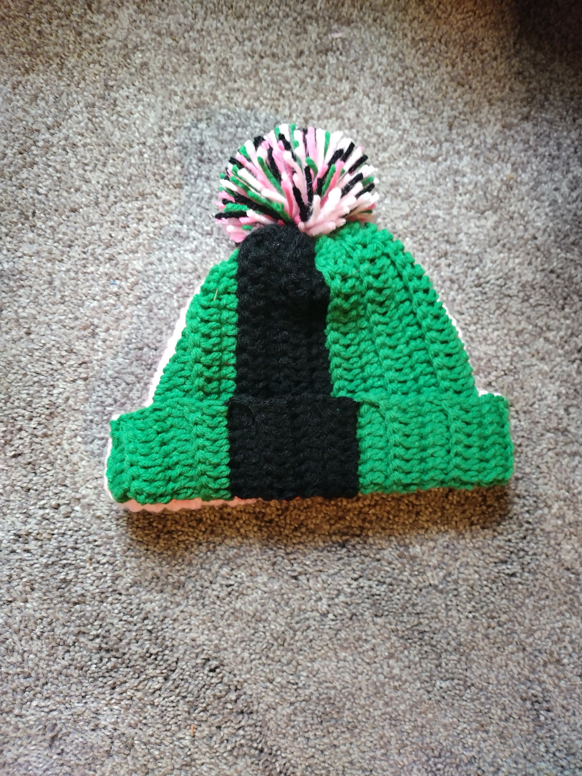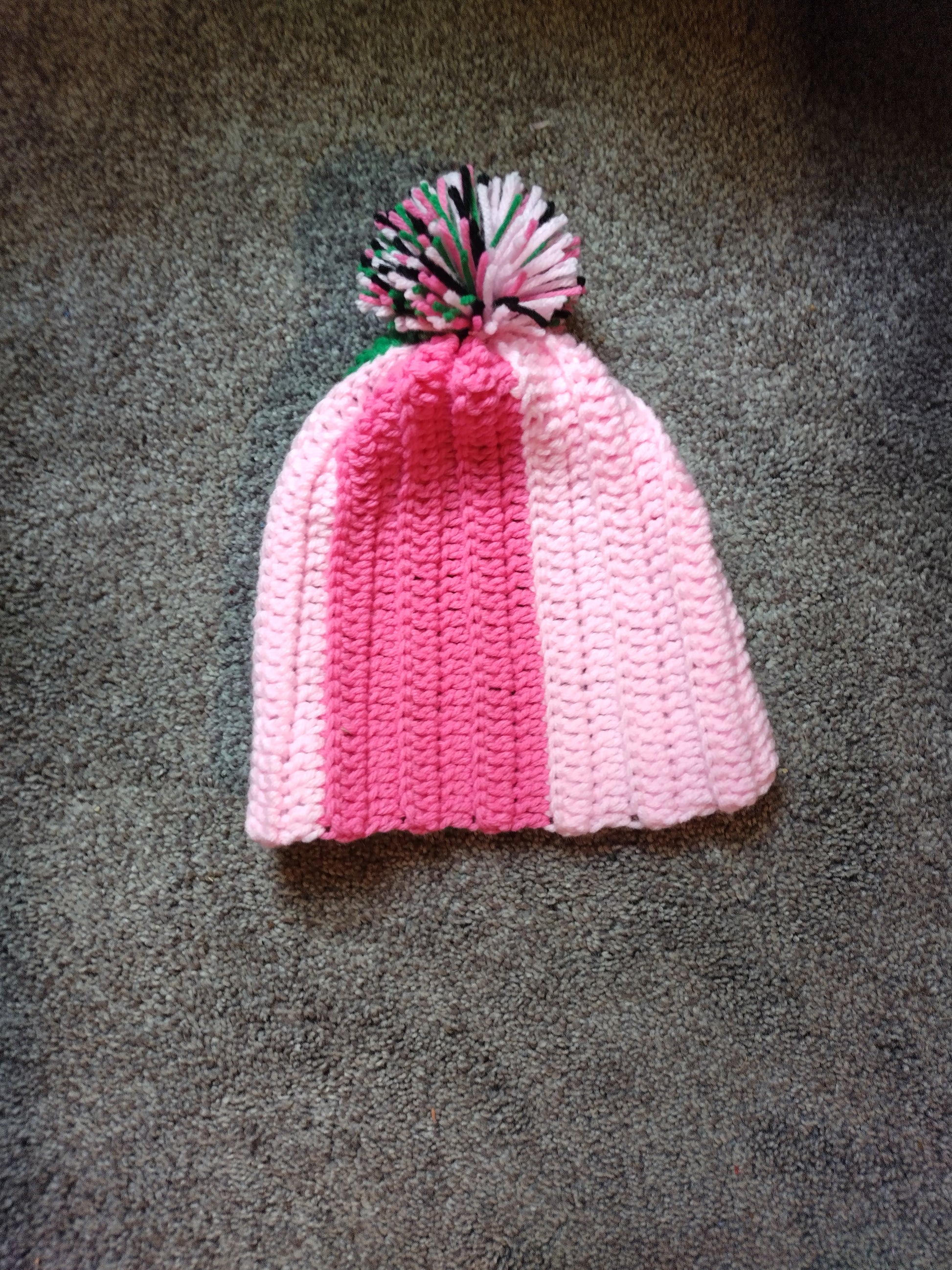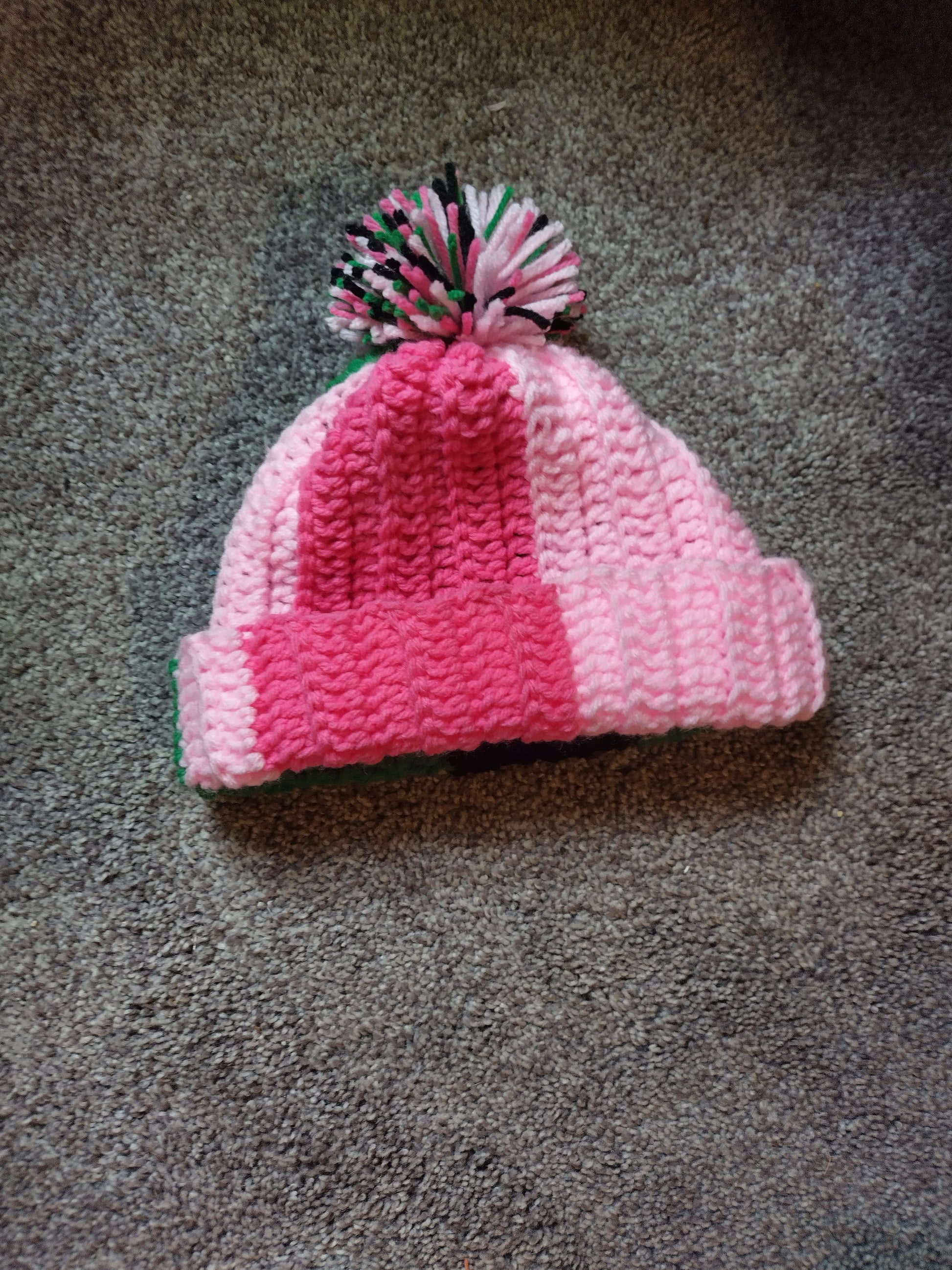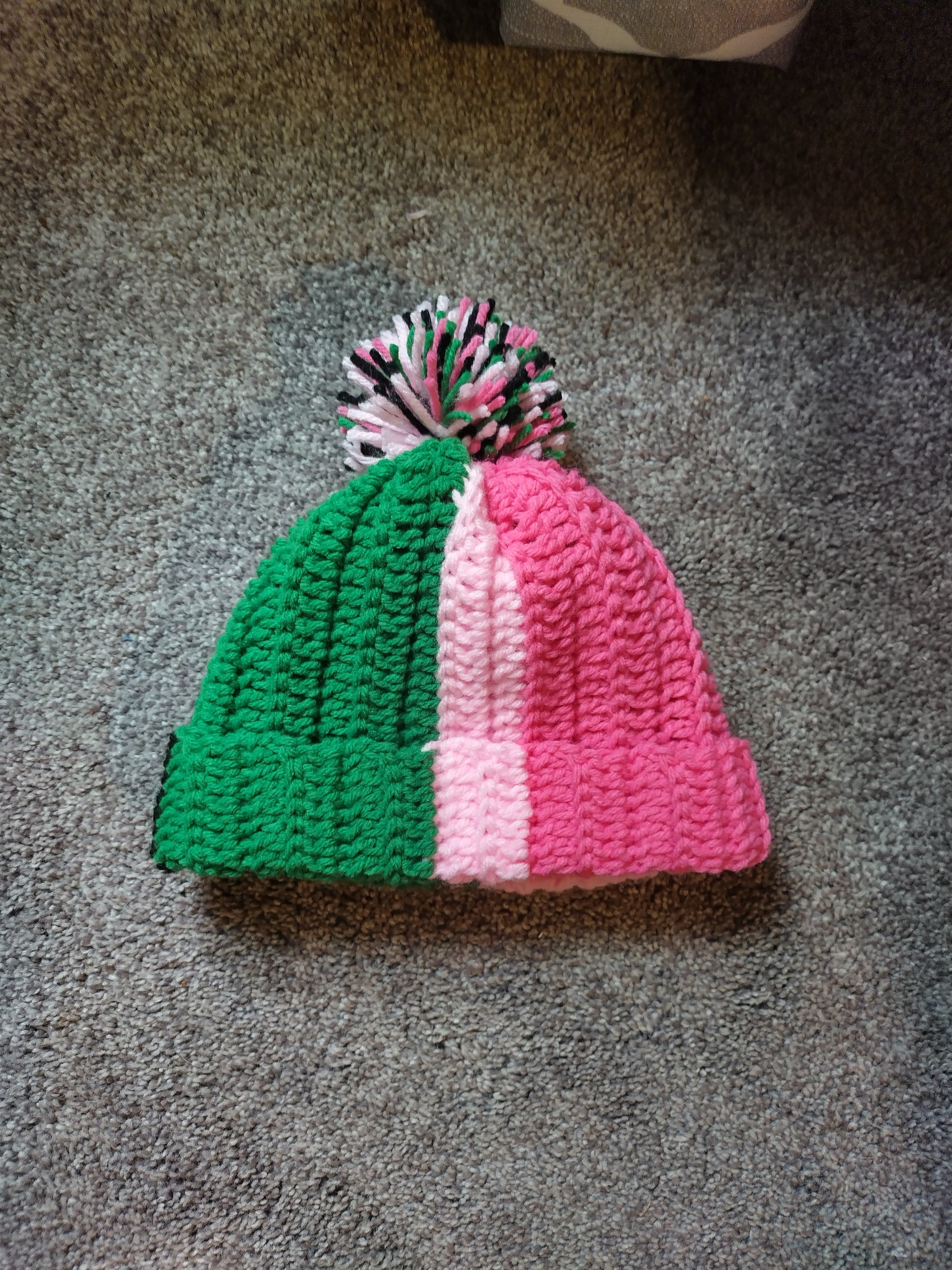 Pink/Green/Black crochet puff beanie.